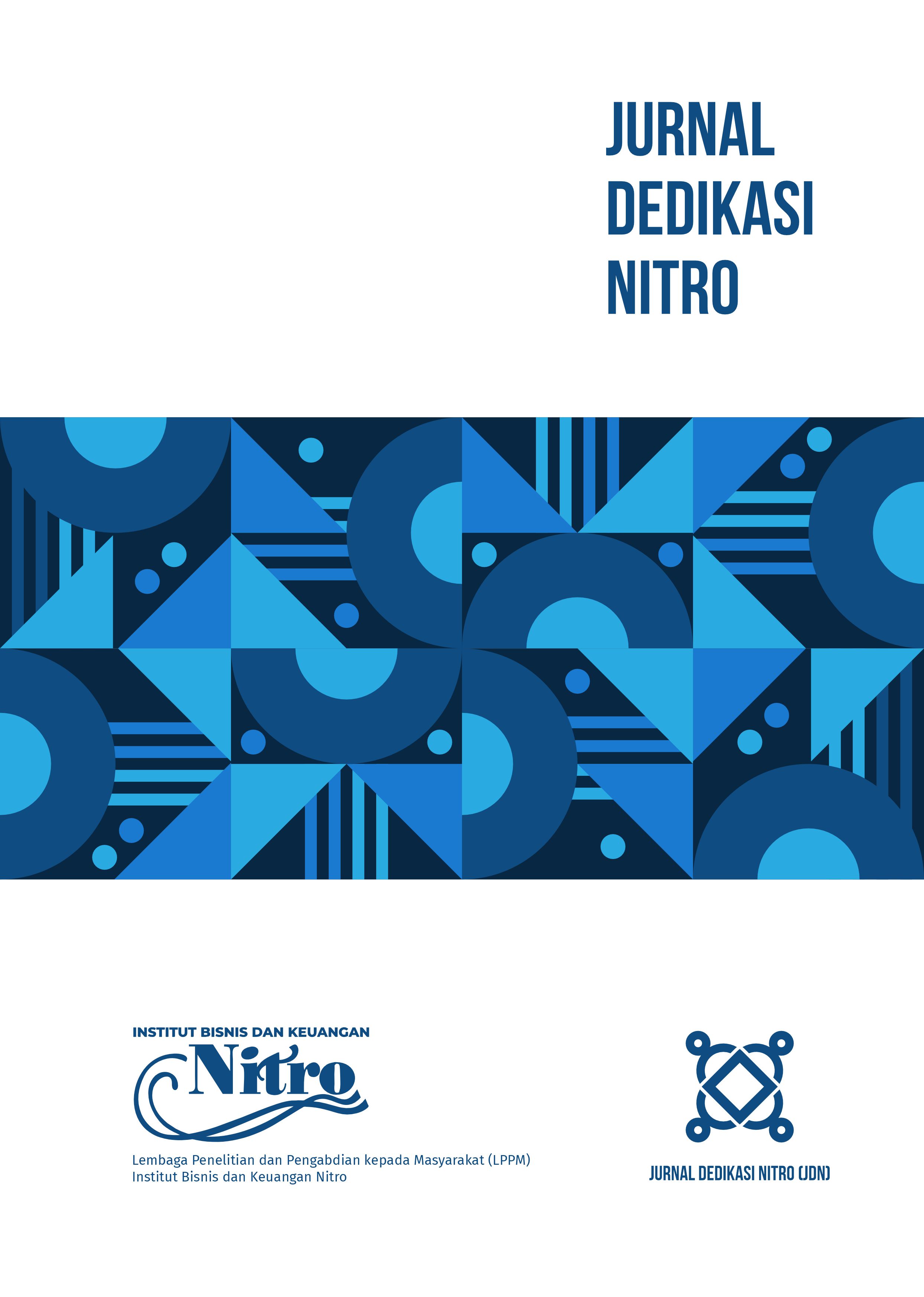 Jurnal Dedikasi NitroJurnal Dedikasi Nitro (JDN) adalah jurnal ilmiah yang diterbitkan oleh Institut Bisnis dan Keuangan Nitro (IBK Nitro) sebagai media publikasi hasil kegiatan Pengabdian kepada Masyarakat (PkM) yang dilakukan oleh dosen, mahasiswa, dan praktisi di berbagai bidang ilmu, khususnya bisnis, keuangan, kewirausahaan, manajemen, akuntansi, dan sosial humaniora. JDN hadir sebagai wadah untuk mendiseminasikan hasil penerapan ilmu pengetahuan, teknologi, dan seni (IPTEKS) yang berorientasi pada pemberdayaan masyarakat, peningkatan kapasitas UMKM, inovasi sosial, serta solusi aplikatif terhadap permasalahan ekonomi dan sosial di Indonesia. Melalui publikasi ini, IBK Nitro berkomitmen untuk membangun budaya kolaborasi akademik dan profesional antara perguruan tinggi, pemerintah, dunia usaha, dan masyarakat dalam mewujudkan pembangunan berkelanjutan.